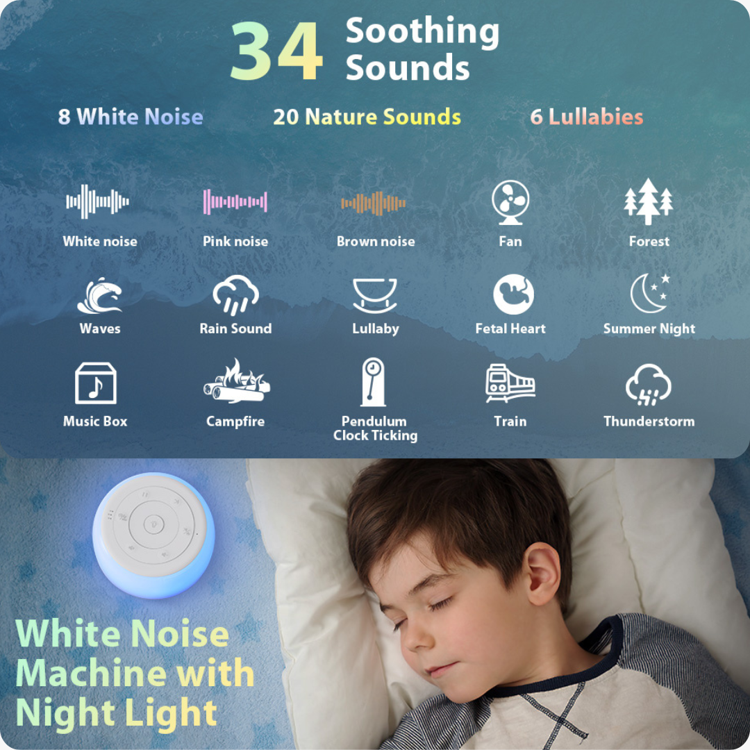 Tauchen Sie ein in die entspannende Klanglandschaft von 34 fachmännisch komponierten Klängen, von sanften Meereswellen bis hin zu einem beruhigenden Schlaflied. Blockieren Sie störende Geräusche und schaffen Sie eine ruhige Umgebung, die sowohl Babys als auch Erwachsenen hilft, in einen tieferen, erholsameren Schlaf zu gleiten. Ob für das Kinderzimmer oder Ihr eigenes Schlafzimmer, diese Klänge sorgen dafür, dass Sie schneller einschlafen und länger schlafen.